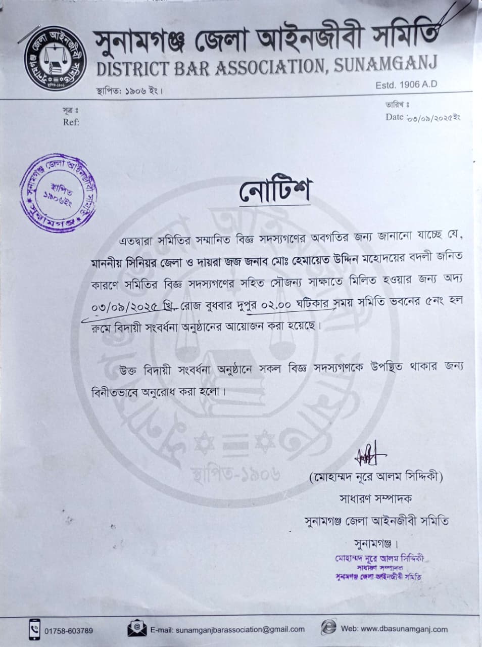 মাননীয় সিনিয়র জেলা ও দায়রা জজ জনাব মোঃ হেমায়েত উদ্দিনের বদলী জনিত
